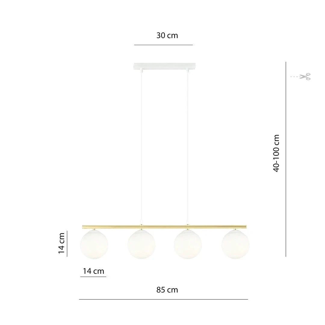 De ALLORA 4 White Opal is een hanglamp die modern design combineert met subtiele glamour. De witte glazen kappen en gepoedercoat staal, afgewerkt met elegante gouden accenten, creëren een verfijnde en onderscheidende uitstraling die perfect past bij zowel eigentijdse als klassieke interieurs.