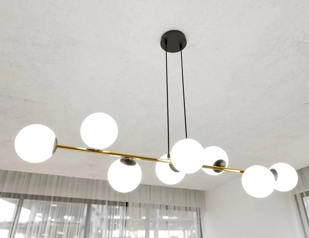 De lamp heeft een in hoogte verstelbare constructie met gepoedercoat stalen behuizing en glazen kappen. Met 8 fittingen, E14 lampvoeten en geschikt voor maximaal 10W LED per fitting. De kap heeft een diameter van 14 cm, het plafondrozetje meet 14×14×3 cm. Geschikt voor 230V en heeft beschermingsklasse IP20.