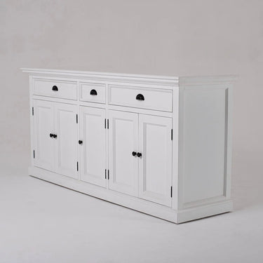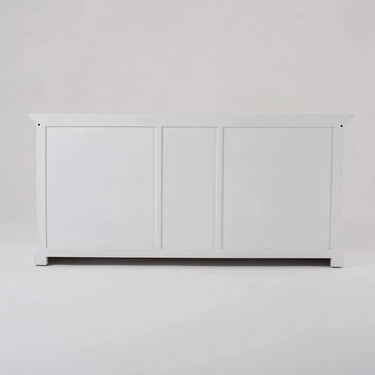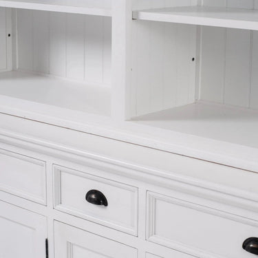 Ruime, veelzijdige hutch-kast in klassieke witte uitstraling, perfect voor de woonkamer of slaapkamer. De kast bestaat uit twee delen: een onderkast met diepe planken en 3 lades voor persoonlijke spullen of linnengoed, en een bovenkast met sierlijke beadboard-achterwanden die boeken en verzamelingen mooi accentueren.